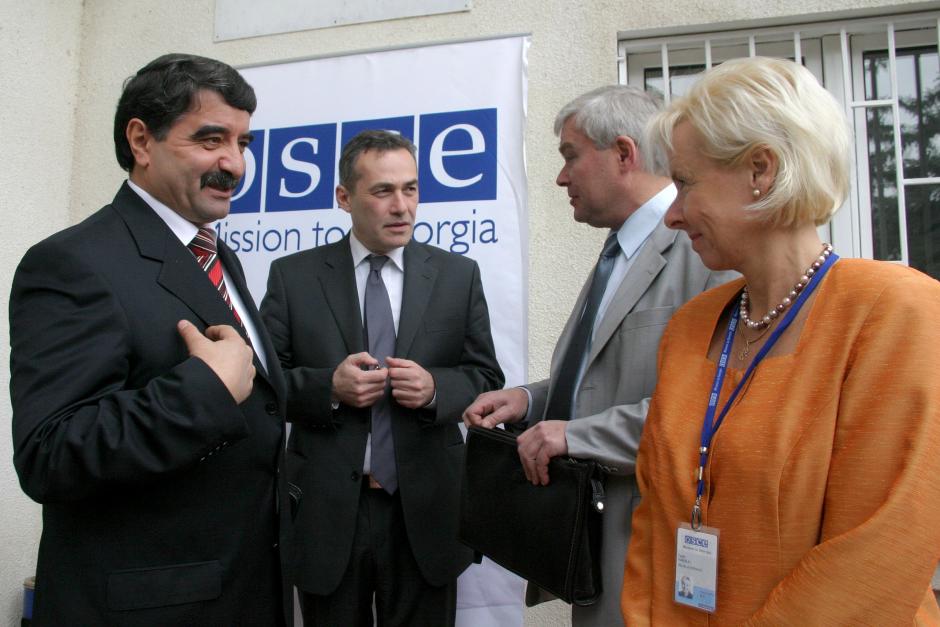 Ambassador Terhi Hakala (right), Head of the OSCE Mission to Georgia, welcomes representatives of the Georgian, South Ossetian, North Ossetian and Russian sides to a Joint Control Commission meeting, Tbilisi, 23 October 2007.