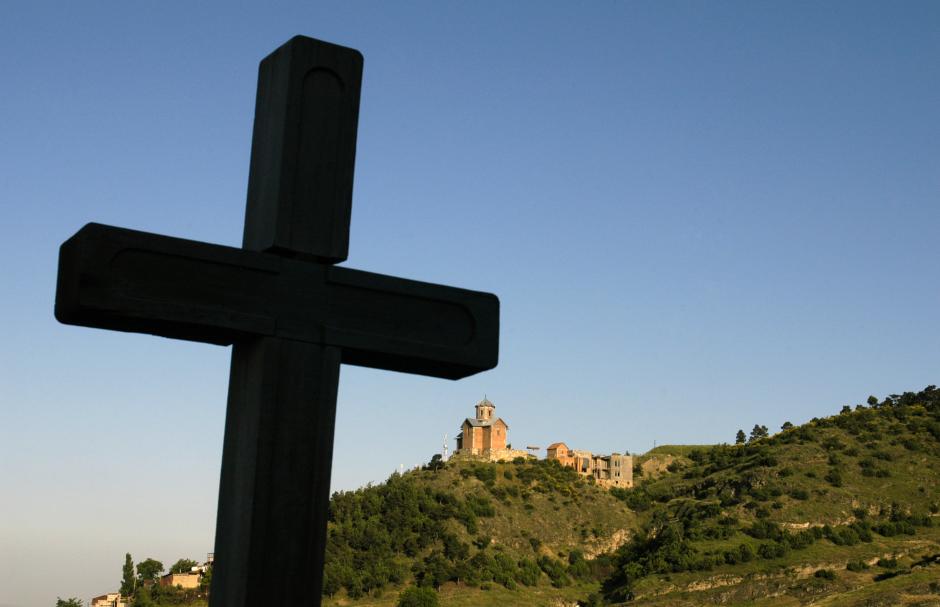 A cross and a church on the hill in Tbilisi, 13 June 2007.