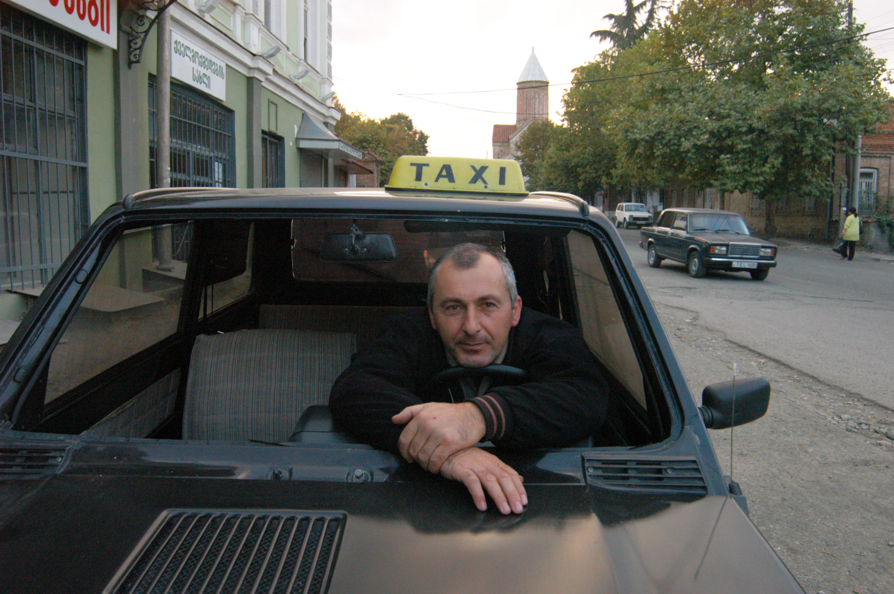 A man looks out from a taxi with the front window missing, in Telavi, Georgia's Kakheti region, 11 October 2007.