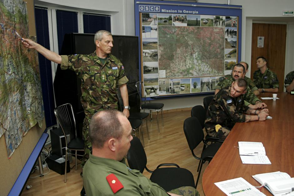 Chief military officer Stephen Young (standing) briefs military monitoring officers at the OSCE Mission to Georgia, 3 September 2008.