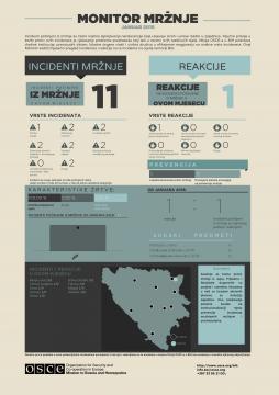 Incidenti počinjeni iz mržnje su često nasilna ispoljavanja netolerancije koja ulijevaju strah i unose razdor u zajednice. Ključno pitanje u borbi protiv ovih incidenata je rješavanje problema predrasuda koji leži u osnovi ovih razdirućih djela. Misija OSCE-a u BiH podržava vladine institucije, pravosudni sistem, lokalne organe vlasti i civilno društvo u efikasnom reagovanju na ovakve vrste incidenata. Ovaj Monitor sadrži mjesečni pregled incidenata i reakcija na te incidente na cijeloj teritoriji BiH.