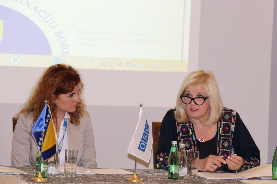 (L-r) Aida Premilovac, službenica za demokratsko upravljanje u Misijii OSCE-a u Bosni i Hercegovini i Vesna Bokšić, predsjednica tima za borbu protiv korupcije Hercegovačko-neretvanskog kantona na radionici pod pokroviteljstvom OSCE-a o jačanju borbe protiv korupcije u Hercegovačko-neretvanskom kantonu; Mostar, 24. septembar 2018. godine