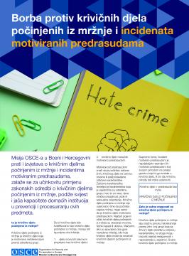 Misija OSCE-a u Bosni i Hercegovini prati i izvještava o krivičnim djelima počinjenim iz mržnje i incidentima motiviranim predrasudama, zalaže se za učinkovitu primjenu zakonskih odredbi o krivičnim djelima počinjenim iz mržnje, podiže svijest i jača kapacitete domaćih institucija u prevenciji i procesuiranju ovih predmeta.