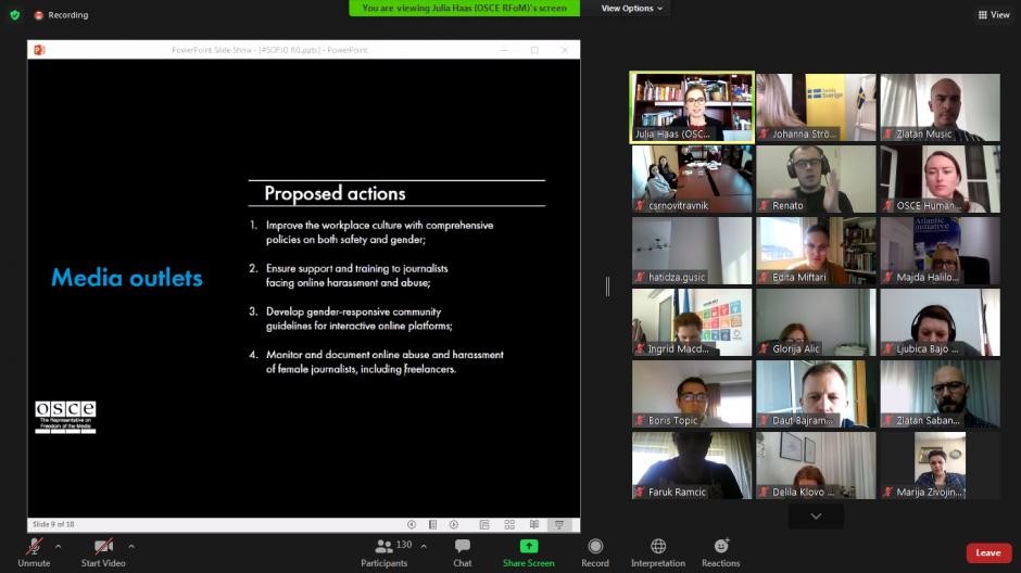 Učesnice i učesnici OSCE-ovog virtualnog okruglog stola "Uznemiravanje žena u javnom prostoru", na kojem je razgovarano o javnom uznemiravanju i prijetnjama usmjerenim ka ženama i djevojkama, 23. februar 2021. godine.