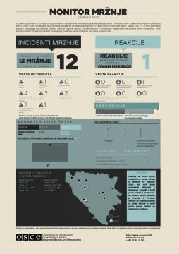 Incidenti počinjeni iz mržnje su često nasilna ispoljavanja netolerancije koja ulijevaju strah i unose razdor u zajednice. Ključno u borbi protiv incidenata počinjenih iz mržnje je suočavanje sa problemom predrasuda, prisutnom u osnovi ovih razdirućih djela. Misija OSCE-a u Bosni i Hercegovini (BiH) podržava vladine institucije, pravosudni sistem, lokalne organe vlasti i civilno društvo u efikasnom reagovanju na ovakve vrste incidenata. Izvještaj sadrži mjesečni pregled incidenata na teritoriji BiH i reakcija javnosti na zabilježene incidente.