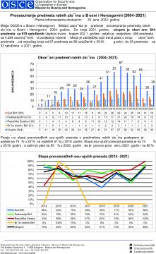 Misija OSCE-a u Bosni i Hercegovini započela je praćenje procesuiranja predmeta ratnih zločina u Bosni i Hercegovini 2004. godine. Do kraja 2021. godine, ukupno je okončano 644 predmeta sa 978 optuženih. Usprkos ovom, krajem 2021. godine ostalo je neriješeno 495 predmeta sa 4.284 osumnjičenih. U posljednje vrijeme, Misija je zabilježila opći trend pada u broju okončanih predmeta, od najvećeg broja od 67 predmeta sa 96 optuženih u 2016. godini, do 35 predmeta sa 53 optužena u 2021. godini.