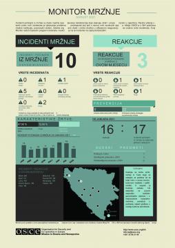 Incidenti počinjeni iz mržnje su često nasilna ispoljavanja netolerancije koja ulijevaju strah i unose razdor u zajednice. Ključno u borbi protiv incidenata počinjenih iz mržnje je suočavanje sa problemom predrasuda, prisutnom u osnovi ovih razdirućih djela. Misija OSCE-a u Bosni i Hercegovini (BiH) podržava vladine institucije, pravosudni sistem, lokalne organe vlasti i civilno društvo u efikasnom reagovanju na ovakve vrste incidenata. Izvještaj sadrži mjesečni pregled incidenata na teritoriji BiH i reakcija javnosti na zabilježene incidente.