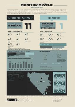 Incidenti počinjeni iz mržnje su često nasilna ispoljavanja netolerancije koja ulijevaju strah i unose razdor u zajednice. Ključno u borbi protiv incidenata počinjenih iz mržnje je suočavanje sa problemom predrasuda, prisutnom u osnovi ovih razdirućih djela. Misija OSCE-a u Bosni i Hercegovini (BiH) podržava vladine institucije, pravosudni sistem, lokalne organe vlasti i civilno društvo u efikasnom reagovanju na ovakve vrste incidenata. "Monitor mržnje" nudi mjesečni pregled incidenata na teritoriji BiH i reakcija javnosti na zabilježene incidente.