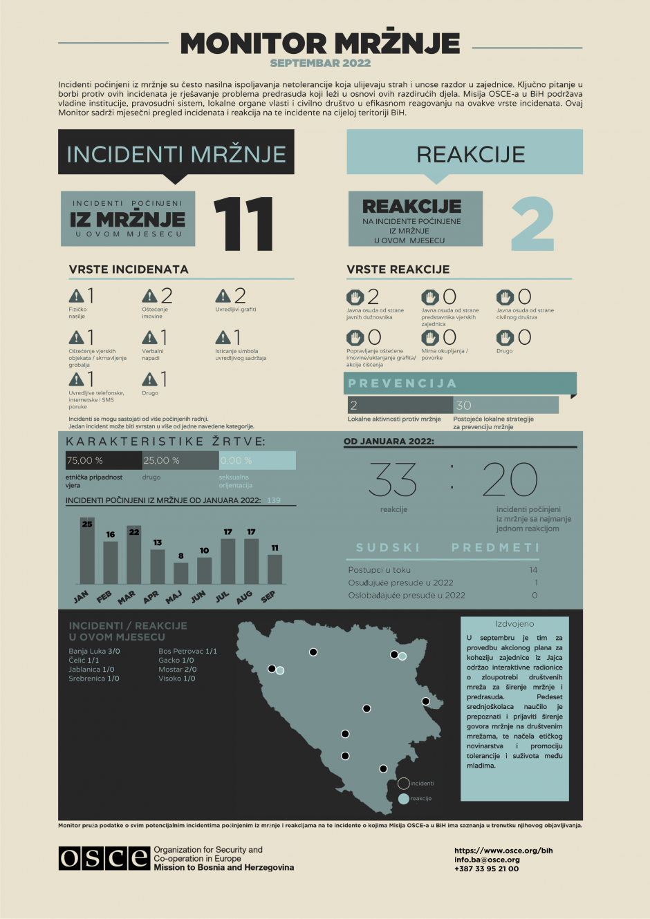 Incidenti počinjeni iz mržnje su često nasilna ispoljavanja netolerancije koja ulijevaju strah i unose razdor u zajednice. Ključno u borbi protiv incidenata počinjenih iz mržnje je suočavanje sa problemom predrasuda, prisutnim u osnovi ovih razdirućih djela. Misija OSCE-a u Bosni i Hercegovini (BiH) podržava vladine institucije, pravosudni sistem, lokalne organe vlasti i civilno društvo u efikasnom reagovanju na ovakve vrste incidenata. "Monitor mržnje" nudi mjesečni pregled incidenata na teritoriji BiH i reakcija javnosti na zabilježene incidente.