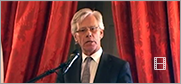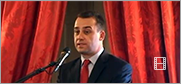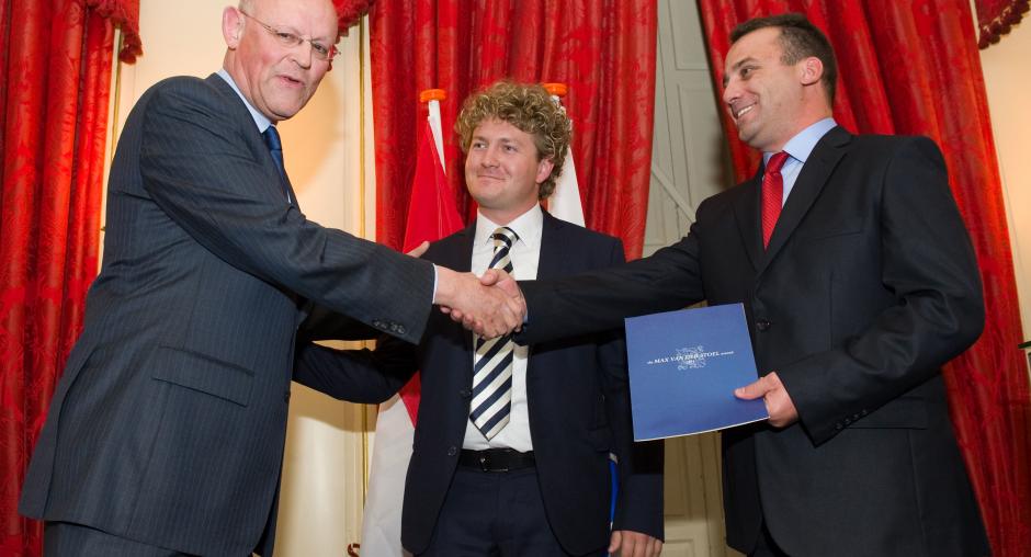 Uri Rosenthal, Minister for Foreign Affairs of the Netherlands (l), presents the Max van der Stoel Award to the winners Sasho Stojkovski (r), Director of the Nansen Dialogue Centre Skopje, and Veton Zekoli (c), project manager at the Nansen Dialogue Centre Skopje. (OSCE/Arnaud Roelofsz) Photo details