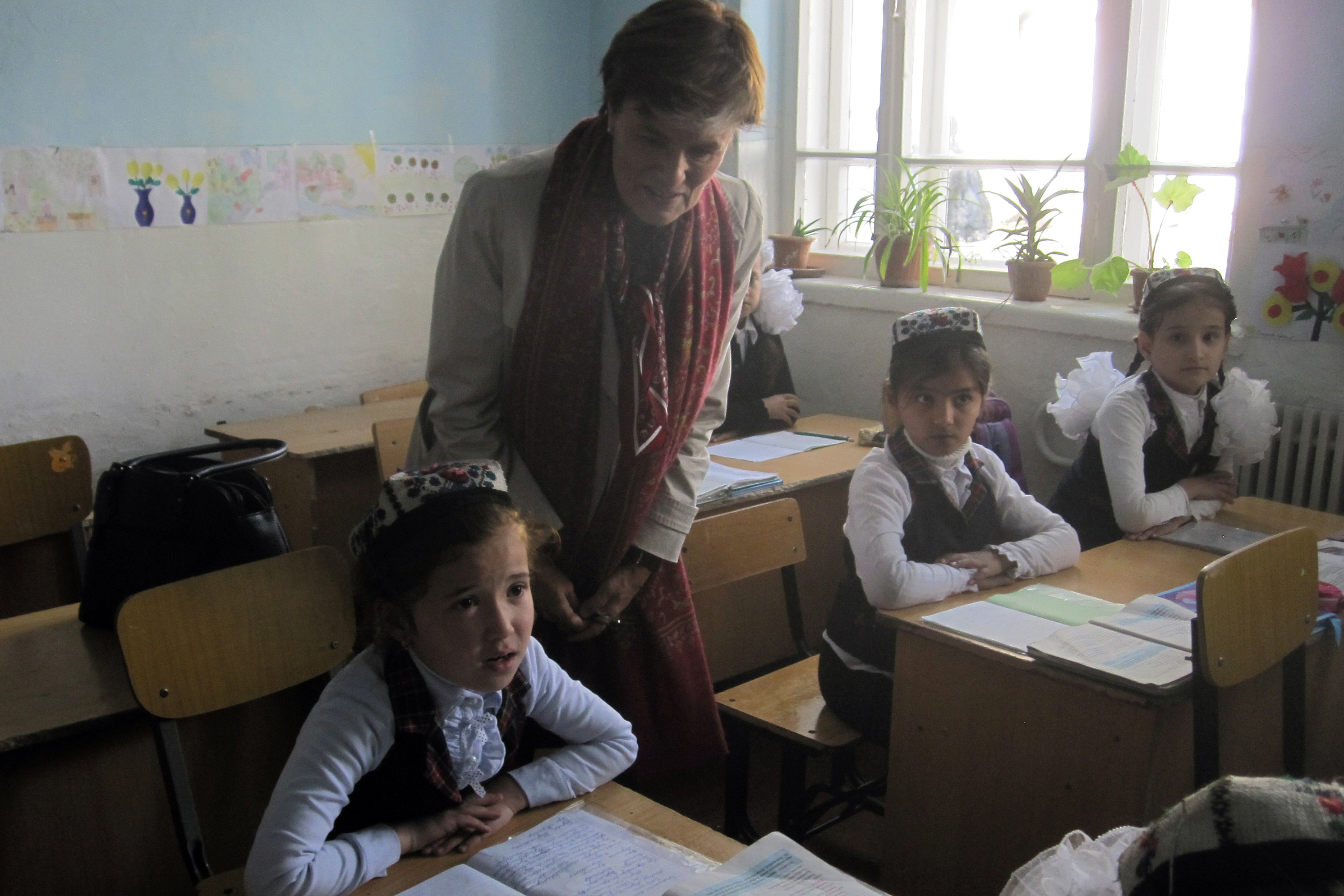 OSCE High Commissioner on National Minorities Astrid Thors meets pupils in an Uzbek-language class at the mixed Tajik-Uzbek School No. 15 in Dushanbe during her visit to Tajikistan, 7 November 2014.