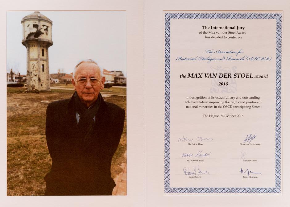 The Max van der Stoel Award certificate presented to Cyprus-based NGO Association for Historical Dialogue and Research (AHDR), The Hague, 24 October 2016.