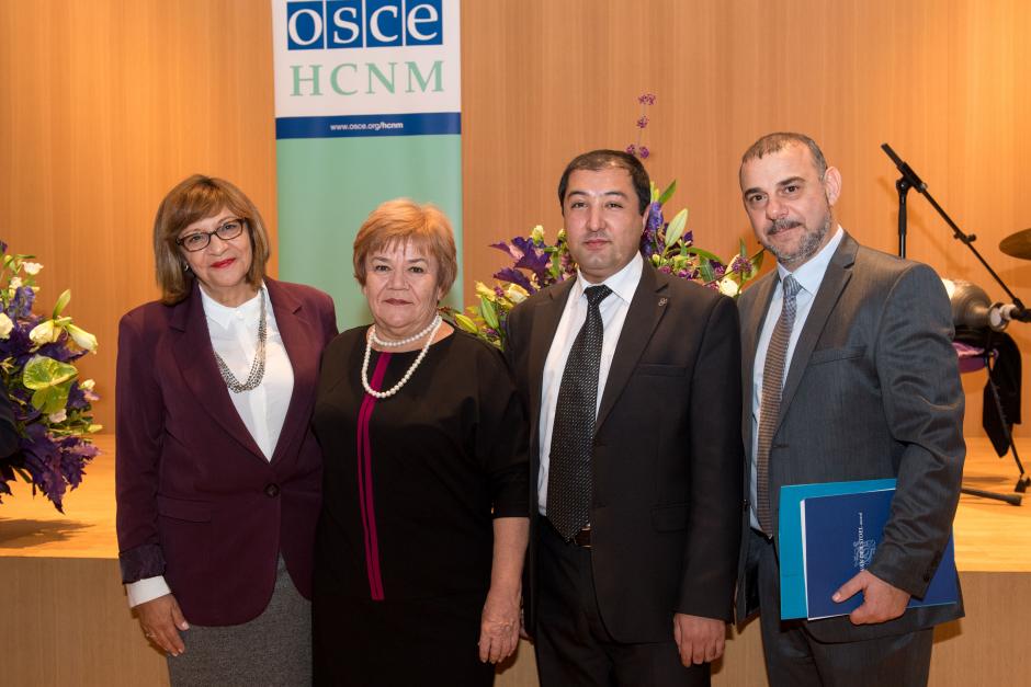 Alev Tuğberk and Kyriakos Pachoulides, Co-Presidents of the Association for Historical Dialogue and Research (AHDR), together with the 2014 winners Valentina Gritsenko, Director, and Utkir Dhzabbarov, Senior Lawyer, Spravedlivost, during the Max van der Stoel Award ceremony, The Hague, 24 October 2016.