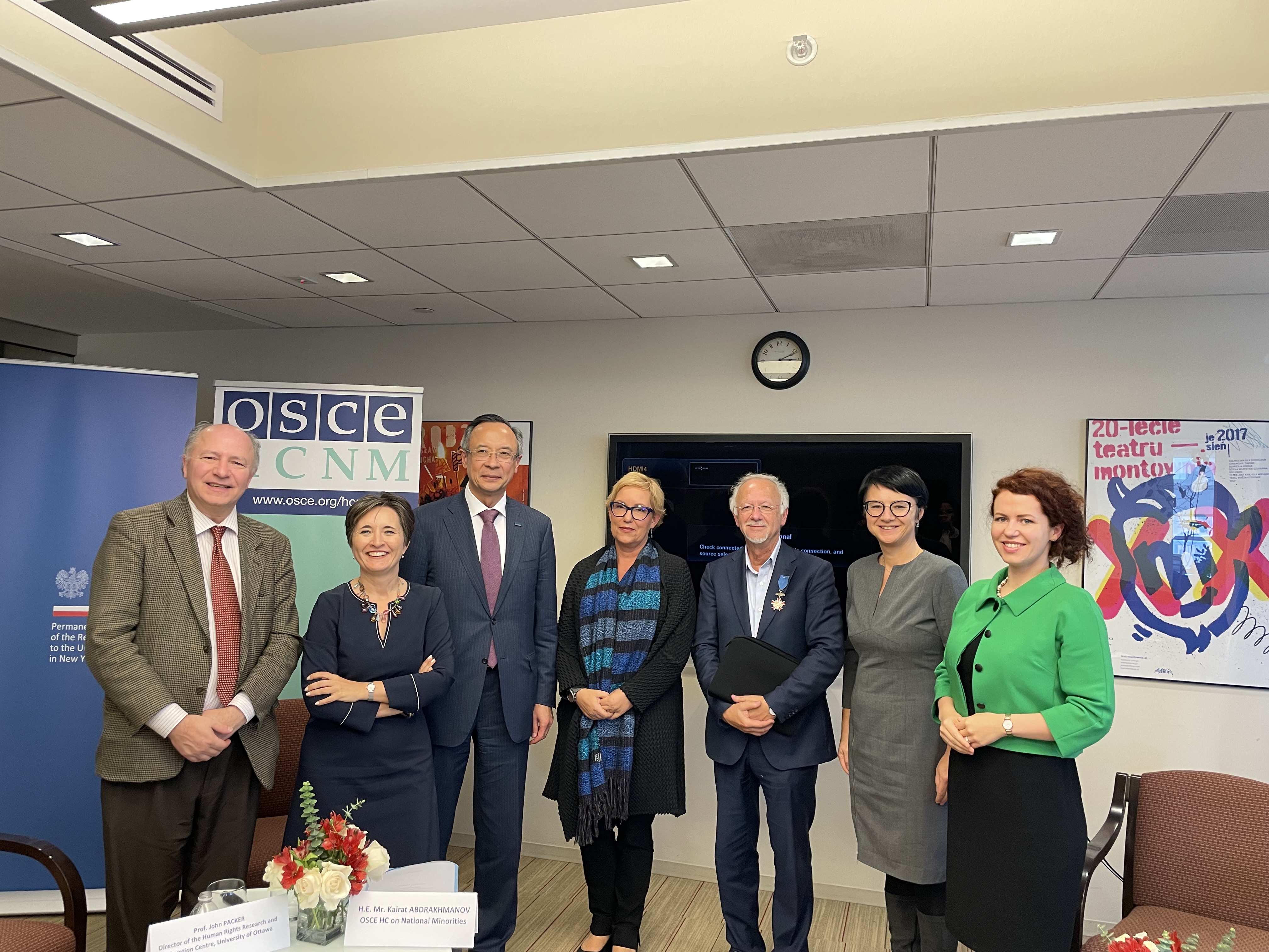From left: Professor John Packer, Director of the Human Rights Research and Education Centre at the University of Ottawa; Joanna Skoczek, First Counsellor, Deputy Permanent Representative of the Republic of Poland to the United Nations in New York; OSCE High Commissioner on National Minorities Kairat Abdrakhmanov; Petra Rota, Professor of international relations University of Ljubljana; UN Special rapporteur on Minority Issues Dr. Fernand de Varennes; Iryna Ulasiuk, HCNM senior adviser and section head; and Elzbieta Kuzborska-Pacha, Senior HCNM Legal Adviser, at an event on the United Nations Declaration on the Rights of Persons Belonging to National or Ethnic, Religious and Linguistic Minorities and considerations relevant to conflicts and conflict prevention, organized with the United Nations Special Rapporteur on Minorities Issues and the Permanent Mission of the Republic of Poland to the United Nations in New York, representing the Chairmanship-in-Office of the OSCE, on the margins of the of the 77th session of the UNGA Third Committee and the presentation of the thematic report by the UN Special rapporteur on Minority Issues, 21 October 2022, New York.
