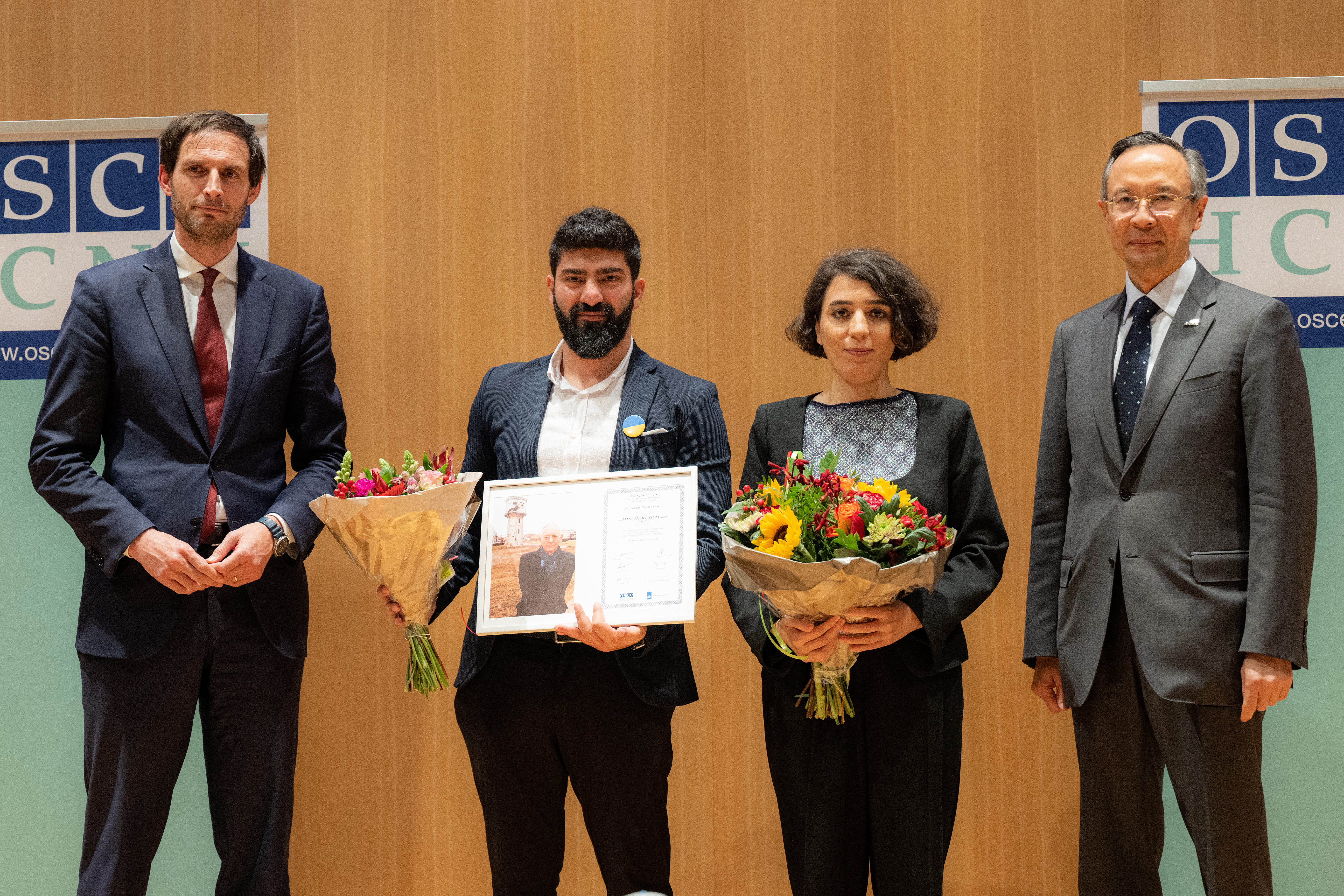 Tamta Mikeladze and Kamran Mammadli receive the 2022 Max van der Stoel Award on behalf of the Social Justice Center, from Georgia, from Dutch Foreign Minister Wopke Hoekstra (left), and OSCE High Commissioner on National Minorities Kairat Abdrakhmanov (right), 24 November 2022, The Hague.
