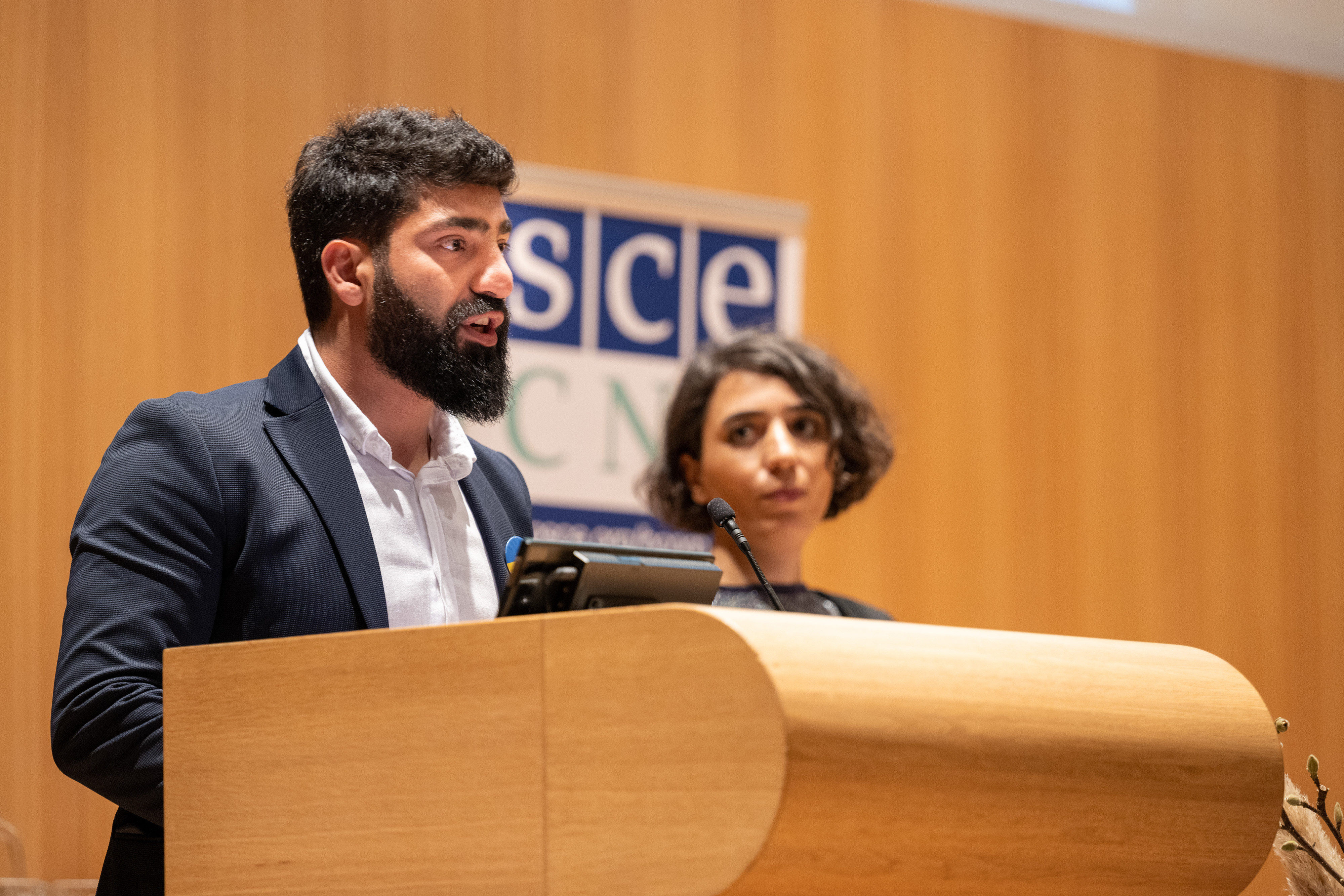 Kamran Mammadli, Researcher at the Social Justice Center, delivers an acceptance speech, after receiving the 2022 Max van der Stoel Award on behalf of the Social Justice Center, from Georgia, 24 November 2022, The Hague.