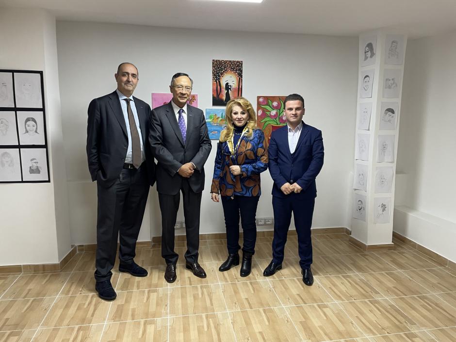 From left: Head of the OSCE Presence in Albania Guido De Sanctis, OSCE High Commissioner on National Minorities Kairat Abdrakhmanov, Head of the Committee on National Minorities of Albania (CNM) Konstantina Bezhani, and CNM Deputy Head Sead Kazanxhiu in the space hosting national minority youth art in the CNM building, Tirana, 9 January 2023.