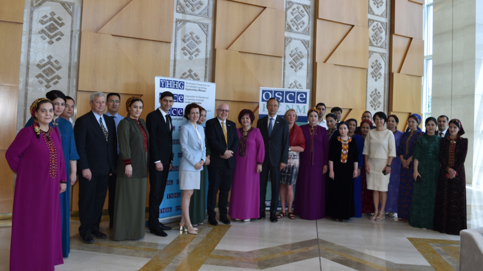 OSCE High Commissioner on National Minorities Kairat Abdrakhmanov together with participants and organizers of the Roundtable on “Good practices of the OSCE participating States in promoting the effective participation of national minorities in public life, including consultative mechanisms”, Ashgabat, 15 June 2023.