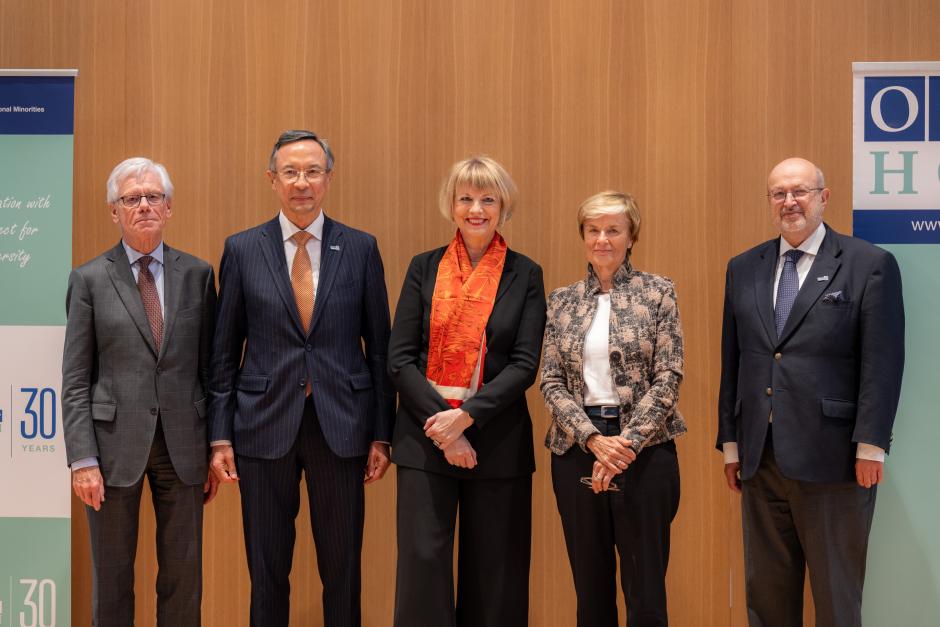 From left: Former High Commissioner Knut Vollebæk, current High Commissioner Kairat Abdrakhmanov, OSCE Secretary General Helga Maria Schmid, and former High Commissioners Astrid Thors and Lamberto Zannier at the institution’s 30th anniversary conference at the Peace Palace, The Hague, 24 October 2023.