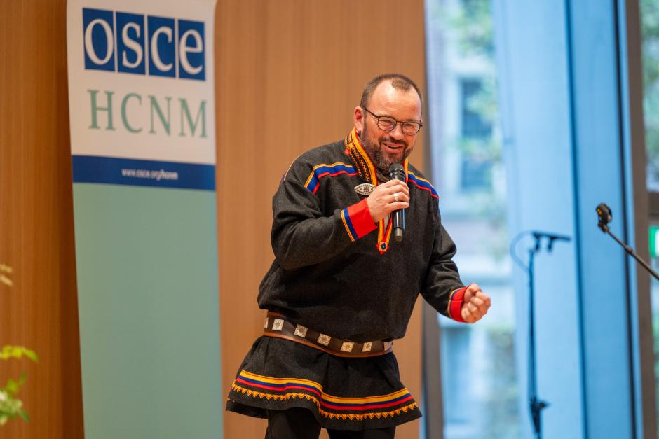Mikkel Gaup, a Norwegian-Sàmi actor, director and multi-artist, performs Áillohaš, a piece deeply rooted in Sàmi tradition, during the 11th Max van der Stoel Award ceremony, 6 November 2024, The Hague.