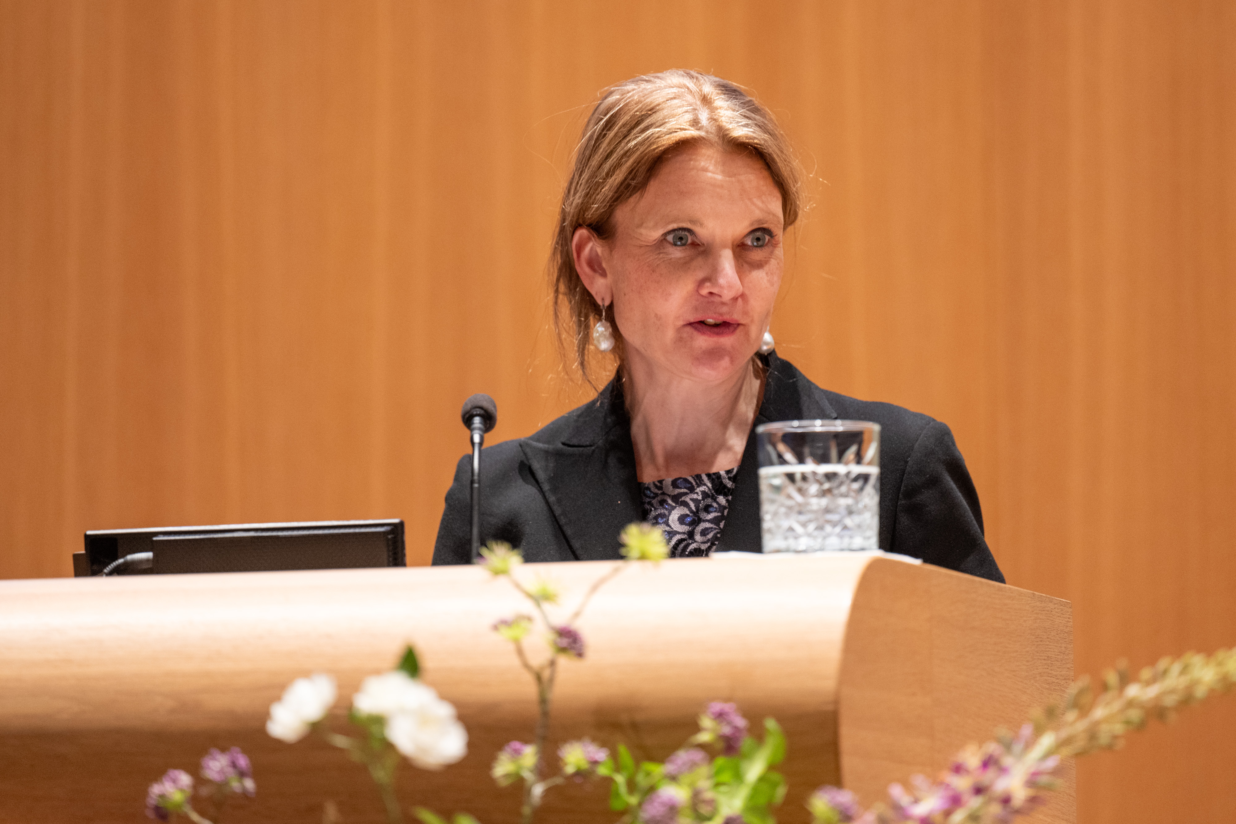 Ellen Svendsen, Permanent Representative of Norway to the OSCE, congratulates the winners, Natur og Ungdom from Norway, during the 11th Max van der Stoel Award ceremony, 6 November 2024, The Hague.