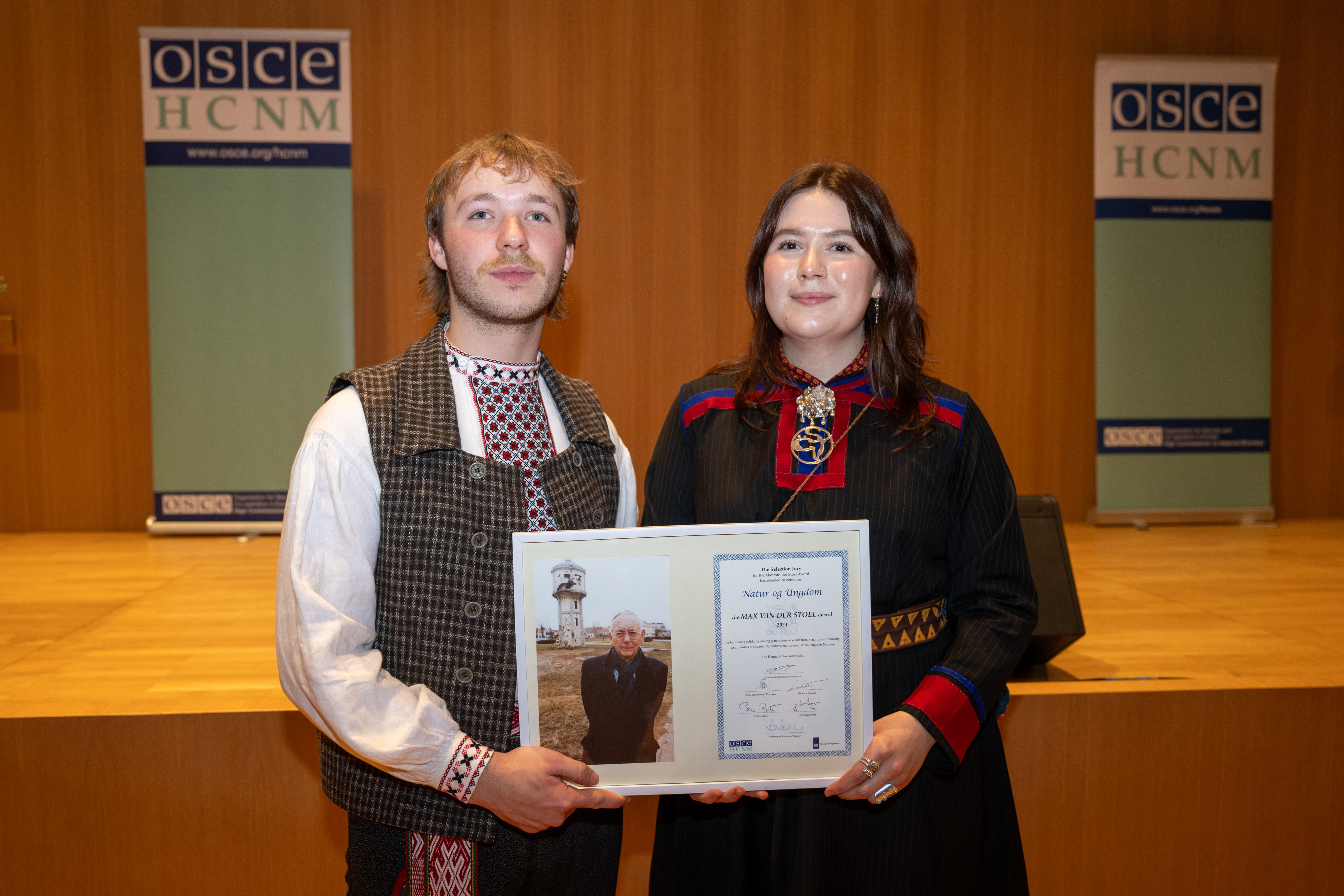 Gytis Blaževičius and Elisabeth Regine Myrland of Natur og Ungdom, during the 11th Max van der Stoel Award ceremony, 6 November 2024, The Hague.