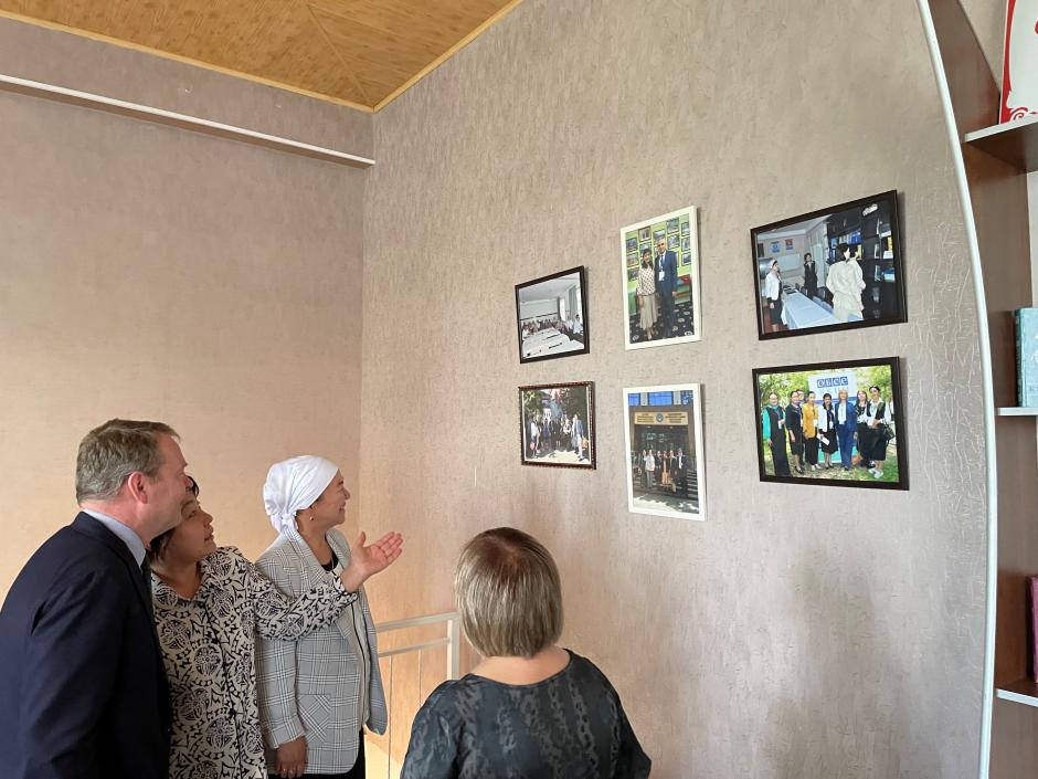 OSCE High Commissioner on National Minorities Christophe Kamp (left) is shown around a pilot school for multilingual education, #8 “Gorkiy”, by Director Barchinai Aidarova and Co-ordinator of Multilingual Education Venera Akybaeva in Osh, Kyrgyzstan, 21 May 2025.