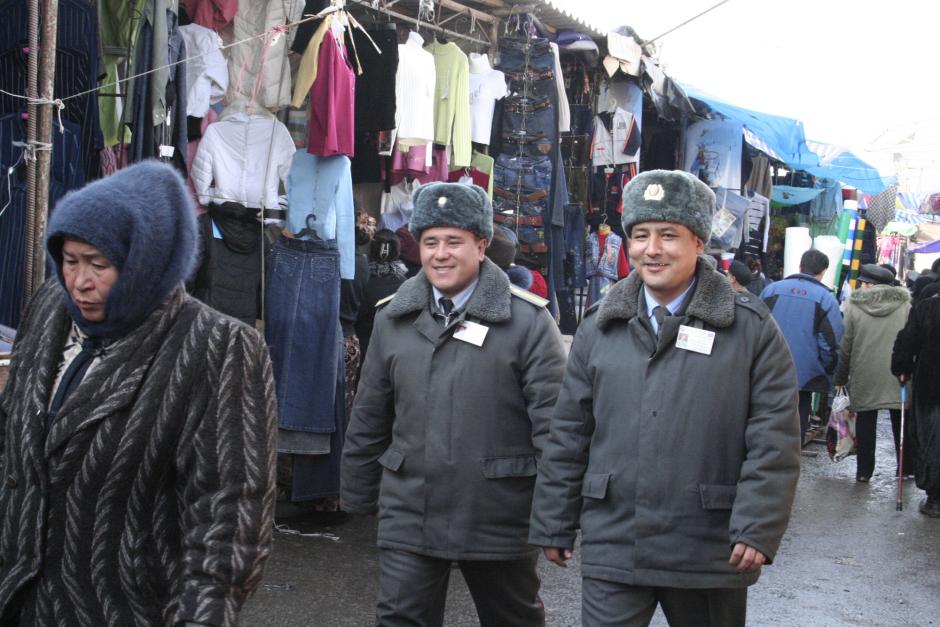 The OSCE High Commissioner on National Minorities promotes the use of ethnically-mixed police teams for patrolling multi-ethnic areas, Osh, Kyrgyzstan, 8 February 2006.