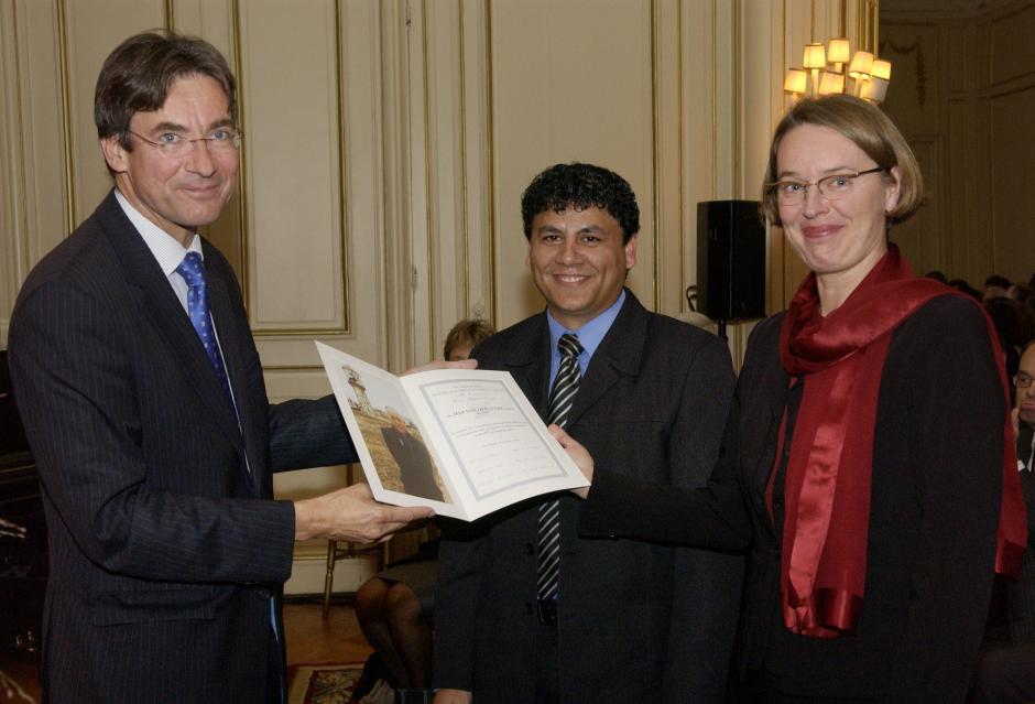 Dutch Foreign Minister Maxime Verhagen (left) presents the 2007 Max van der Stoel Award to Vera Egenberger and Dzavit Berisa of the European Roma Rights Centre, The Hague, 16 October 2007.