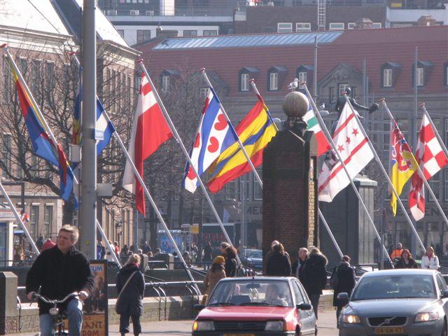 A number of flags, including the one belonging to the Dutch Frisian minority, are displayed in front of the Parliament building in The Hague.
