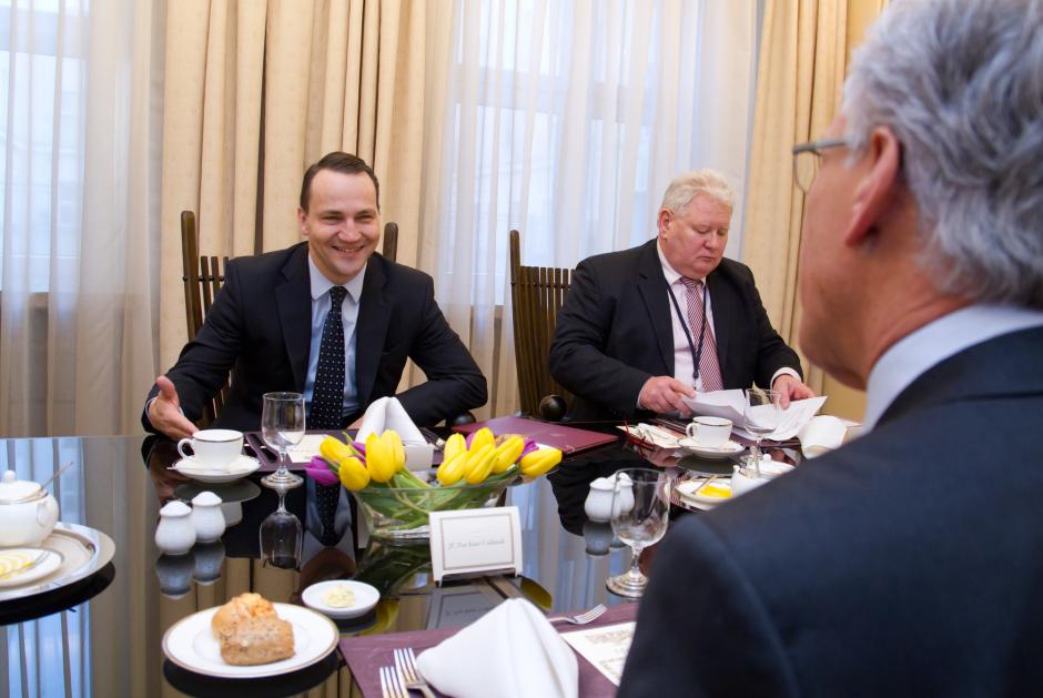 OSCE High Commissioner on National Minorities Knut Vollebaek (foreground) meets with Polish Foreign Affairs Minister Radoslaw Sikorski (left) and Minister Counsellor Krzysztof Drzewicki, Warsaw, 30 March 2012.