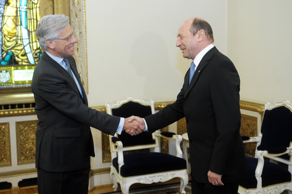 OSCE High Commissioner on National Minorities Knut Vollebaek (l) and President of Romania Traian Băsescu shake hands after their meeting in Bucharest, 24 April 2012.