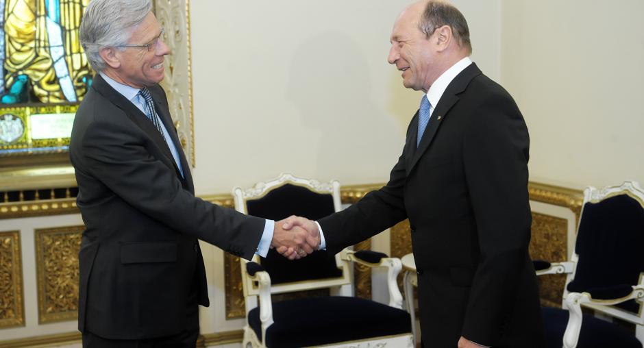 OSCE High Commissioner on National Minorities Knut Vollebaek (l) and President of Romania Traian Băsescu shake hands after their meeting in Bucharest, 24 April 2012. (www.presidency.ro) Photo details