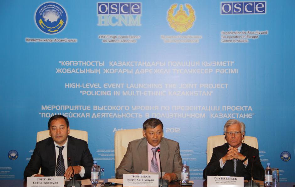Kazakhstan's Deputy Chairperson of the Assembly of the People of Kazakhstan Eraly Tugzhanov (l) and Deputy Interior Minister Kairat Tynybekov (c) with OSCE High Commissioner on National Minorities Knut Vollebaek at a high-level event to launch a project on policing in multi-ethnic Kazakhstan, 26 June 2012, Astana.