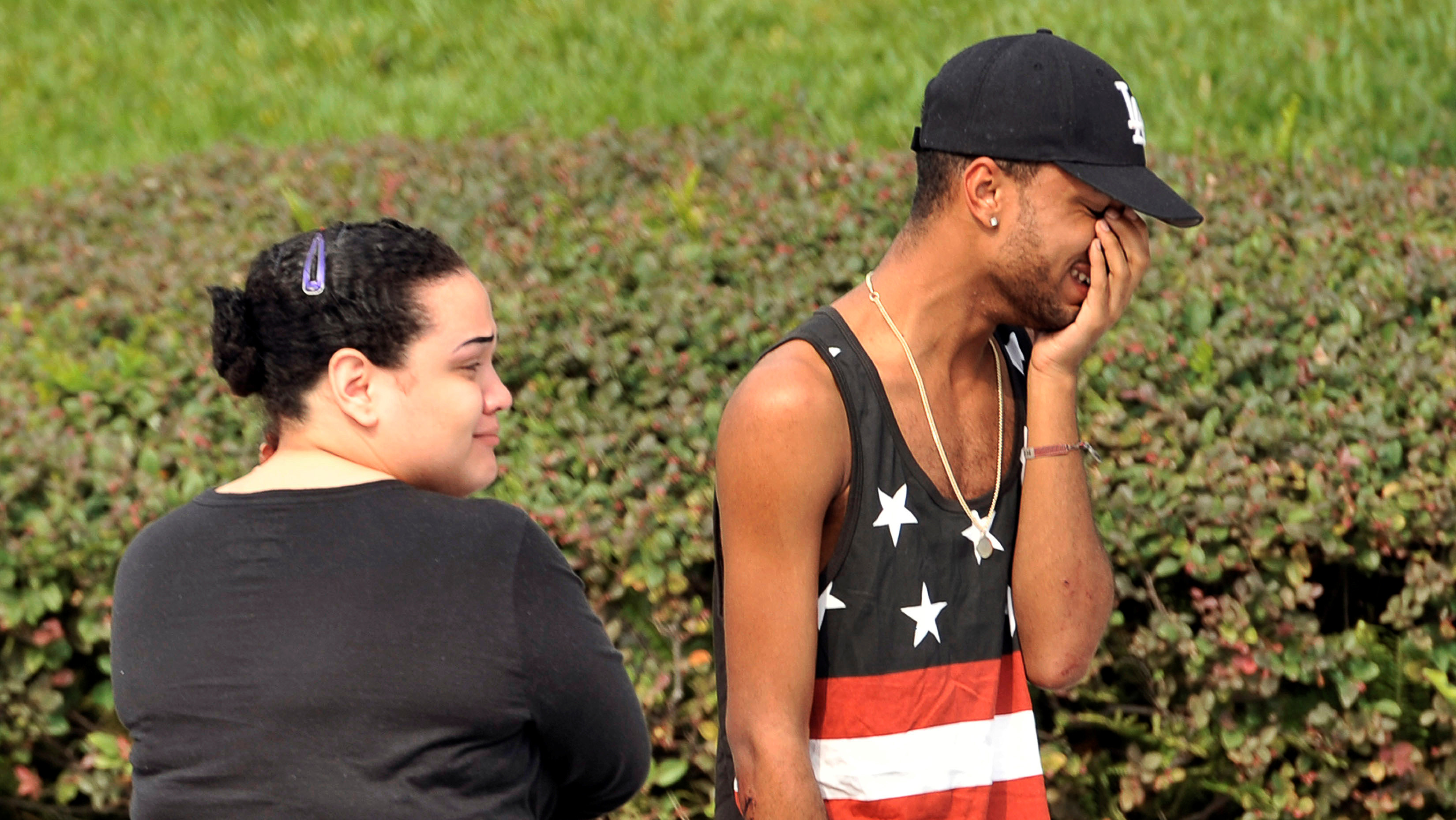 Friends and family members outside the Orlando Police Headquarters during the investigation of a shooting at the Pulse nightclub, Orlando, 12 June 2016.