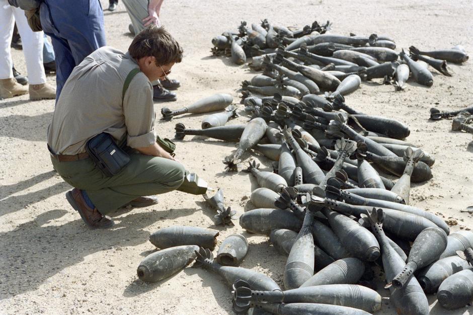 A UN weapons inspector uses a chemical air monitor to detect leakage from a CS-filled 120mm mortar shell, Fallujah, 15 April 1992 .