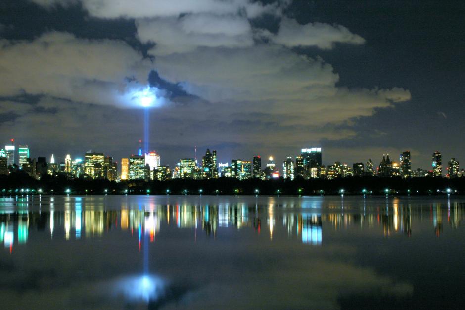 An image by Flickr user LarimdaME – Gene Han – of the Manhattan skyline, featuring the annual 'Tribute in Light' memorial to the victims of 9/11, New York, 11 September 2006.
