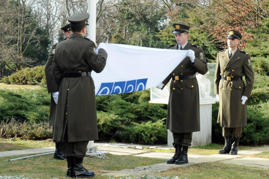 The OSCE flag is lowered in the Croatian capital, marking the formal closure of the OSCE's office, Zagreb, 17 January 2012.