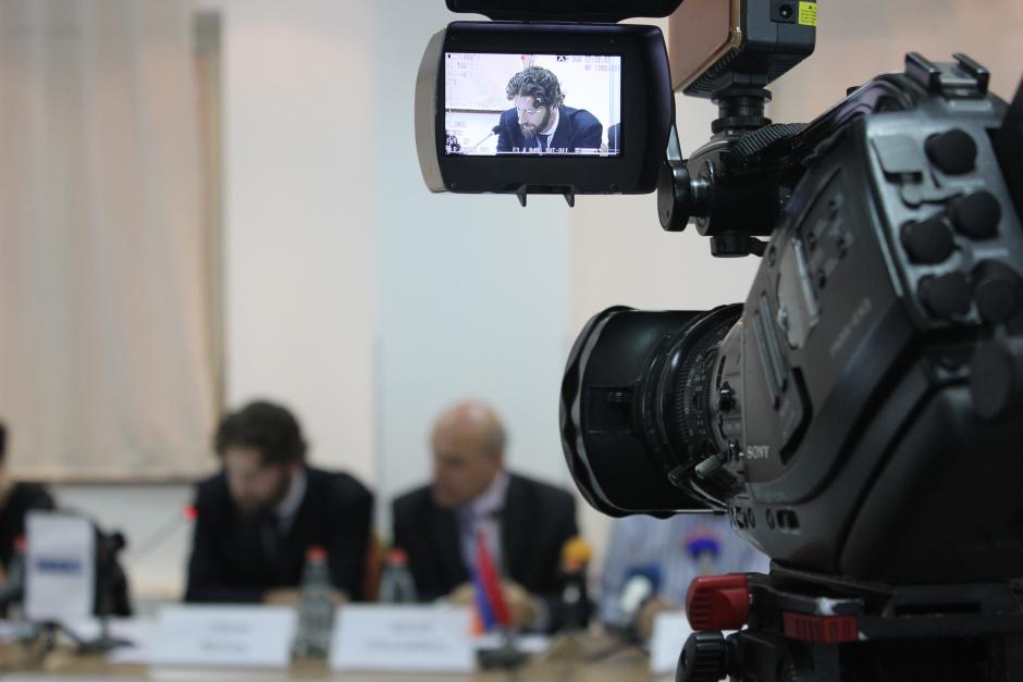 ԵԱՀԿ երևանյան գրասենյակի ժովովրդավարացման ծրագրի ղեկավար Օլիվեր Մակքոյը ելույթ ունենալիս՝ անալոգայինից թվային հեռարձակմանն անցնելու գործընթացի վերաբերյալ զեկույցի շնորհանդեսի ժամանակ