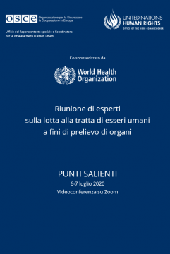 Punti salienti della riunione di esperti sulla lotta al tratta di esseri umani per il prelievo di organi, co-organizzata dall'Ufficio del Rappresentante speciale e Coordinatore dell'OSCE per la lotta alla tratta di esseri umani e dall'Ufficio dell'Alto commissario delle Nazioni Unite per i diritti umani (UNHCHR), 6 - 7 luglio 2020. L'evento è stato anche co-sponsorizzato dall'Organizzazione Mondiale della Sanità (OMS).