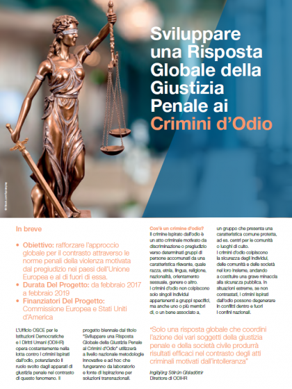 L’Ufficio OSCE per le Istituzioni Democratiche e I Diritti Umani (ODIHR) opera costantemente nella lotta contro i crimini ispirati dall’odio, potenziando il ruolo svolto dagli apparati di giustizia penale nel contrasto di questo fenomeno. Il progetto biennale dal titolo “Sviluppare una Risposta Globale della Giustizia Penale ai Crimini d’Odio” utilizzerà a livello nazionale metodologie innovative e ad hoc che fungeranno da laboratorio e fonte di ispirazione per soluzioni transnazionali.