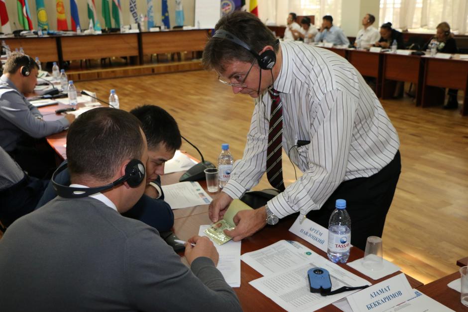 Аустриядан келген сарапшы практикалық жаттығу барысында қатысушыларға жалған жол жүру құжаттарын анықтау рәсімдерін түсіндіру үстінде, Алматы, 20 қыркүйек 2017 ж.