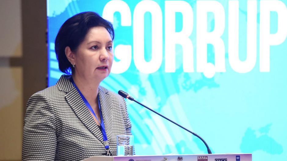 Қазақстан Республикасының мемлекеттік хатшысы Гүлшара Әбдіқалықова сыбайлас жемқорлыққа қарсы іс-қимыл жөніндегі халықаралық конференцияда сөз сөйлеуде, Астана, 8 желтоқсан 2017 ж.