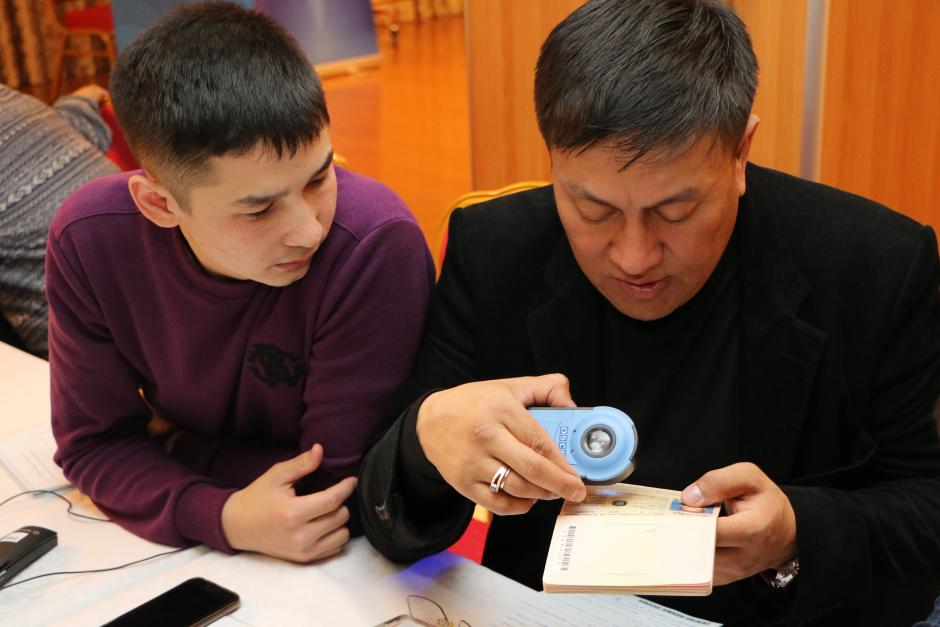 Тренингтің қатысушылары жол жүру құжатын жалған белгілерді анықтау мақсатымен мобильді тексеру құралымен зерттеуде, Шымкент, 21 ақпан 2018 ж.