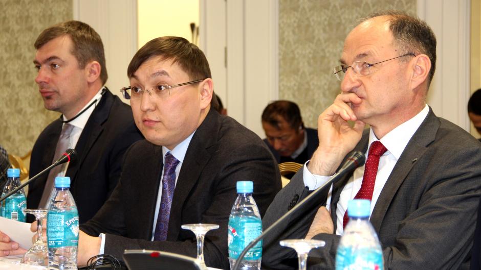 (оңнан солға қарай) Елші Дьердь Сабо, Астанадағы ЕҚЫҰ Бағдарламалар офисінің басшысы, Прімқұлов Ахметжан, Энергетика министрлігінің Экологиялық реттеу және бақылау комитетінің төрағасы және Мартин Смутный, СЭБ бойынша БҰҰ Климаттың өзгеруі туралы негіздемелік конвенциясының халықаралық кеңесшісі қоғамдық тыңдаудың ашылуында сөз сөйлеуде, Астана, 6 наурыз 2018 ж. (ЕҚЫҰ/Айгүл Жарас)