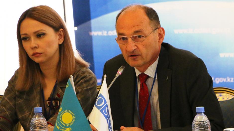 Елші Дьердь Сабо, Астанадағы ЕҚЫҰ Бағдарламалар офисінің басшысы, жыл сайынғы Шәйкенов оқулары конференциясында сөз сөйлеуде. Астана, 15 маусым 2018 ж.