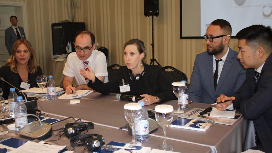 ЕҚЫҰ экономикалық мәселелер жөніндегі қызметкері Тереза Альбано (ортада), Орталық Азияда еңбек көші-қоны саласындағы тәжірибені жетілдіру бойынша іш-шарада сөз сөйлеуде, 26 маусым, 2018 ж.