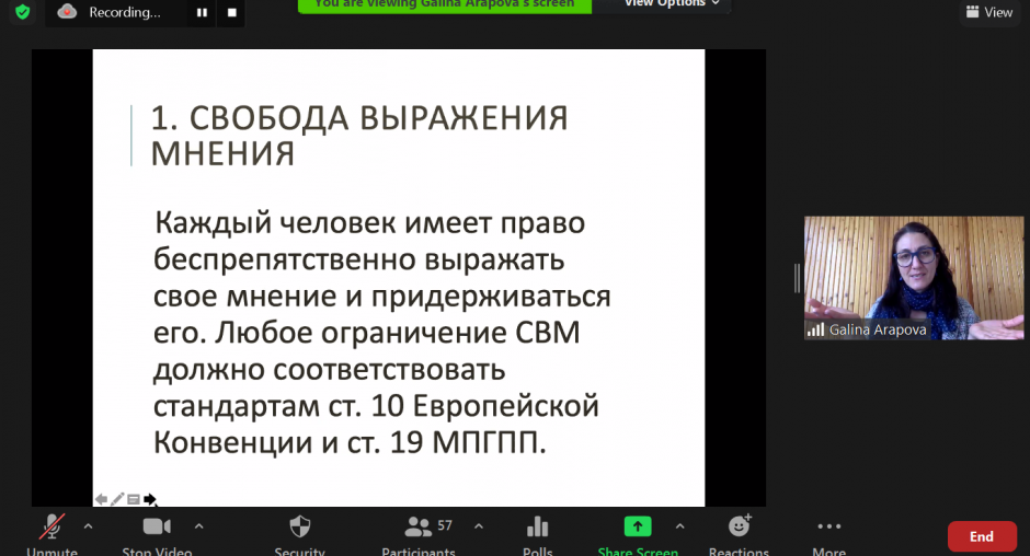 Халықаралық сарапшы Ресей Федерациясында диффамация институты және заң жүйесіндегі беделді қорғау, диффамация мен адам құқықтары арасындағы байланыс және халықаралық стандарттарды қолдану туралы презентация жасады. Қатысушылар бірнеше практикалық істерді, беделді және диффамацияны сот арқылы қорғаудың негізгі элементтері қарастырды. Сарапшы сонымен бірге Ресей Федерациясы мен Қазақстанның заңнамаларын салыстырып, қатысушылармен сот тәжірибесін жетілдіру жолдарын талқылады.