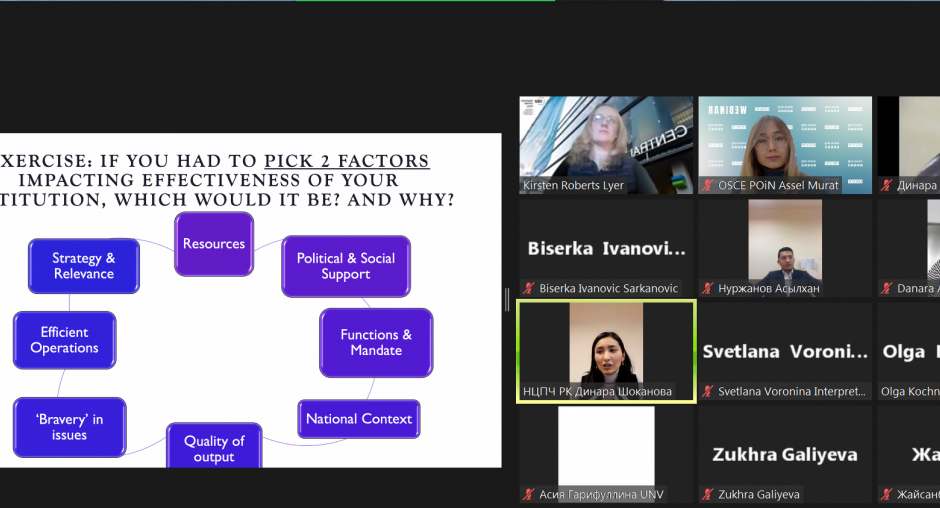 2021 жылғы 5 қарашада ЕҚЫҰ қолдауымен Адам құқықтарын ынталандыру және қорғау жөніндегі ұлттық институттардың мәртебесіне қатысты қағидаларға (Париж қағидалары, 1993 ж.) және адам құқықтары жөніндегі баяндаманы жазуға арналған үш күндік оқыту семинары өтті. Шараны Нұр-Сұлтандағы ЕҚЫҰ Бағдарламалар офисі Адам құқықтары жөніндегі ұлттық орталықпен бірлесіп ұйымдастырды.