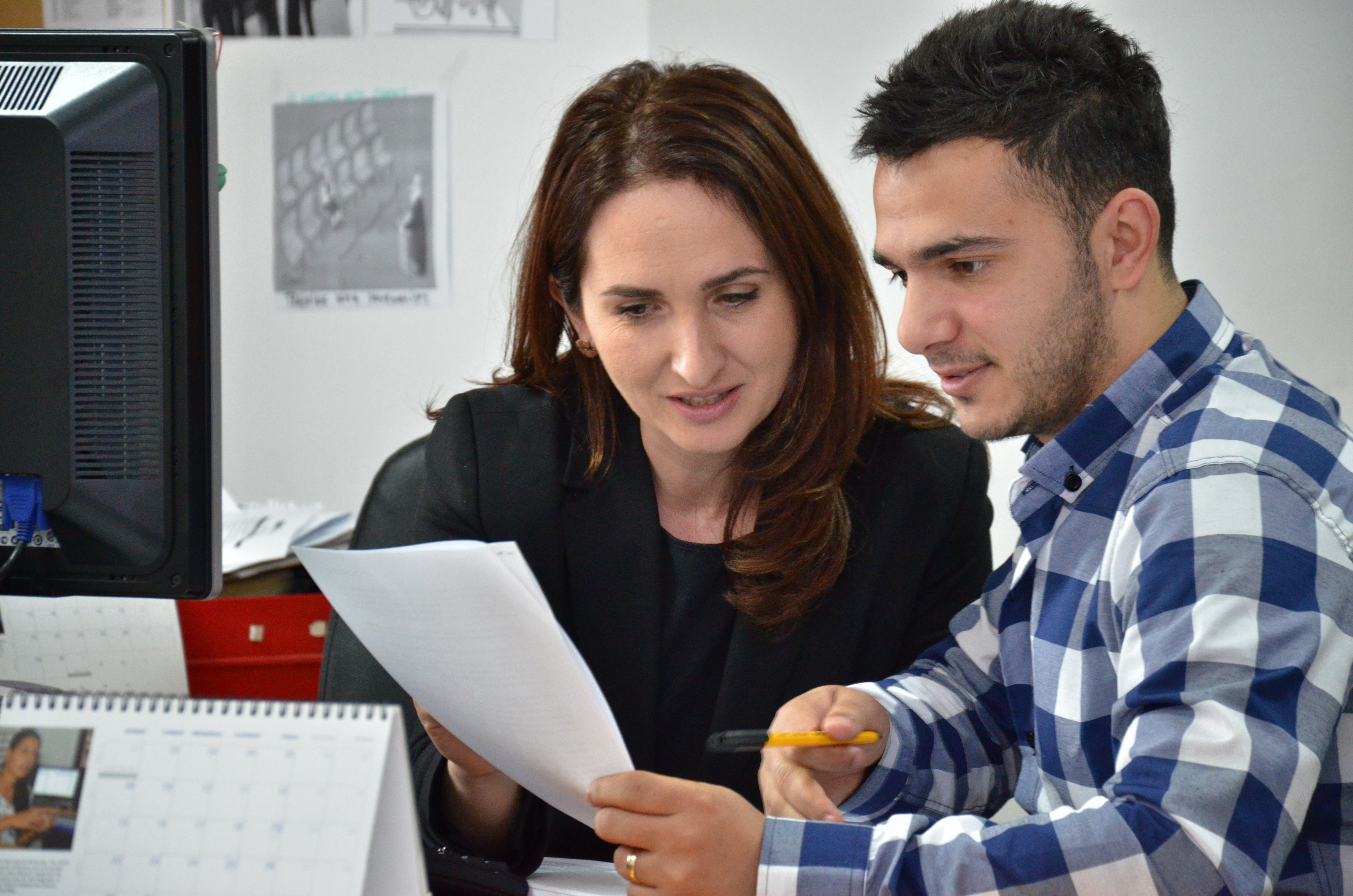 Erxhan Galushi and his OSCE colleague, Elita Vokshi, plan support activities while reviewing the governmental Strategy and Action Plan for the Integration of Roma, Ashkali and Egyptian Communities in Kosovo, 4 April 2013.